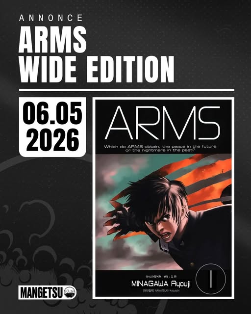 Lauréat du 44e prix Shogakukan du meilleur manga shônen en 1999, ARMS, de Kyoichi Nanatsuki (scénario) et Ryoji Minagawa (dessins), sera à découvrir dans une nouvelle édition sur le modèle de la « Wide Edition » japonaise (format agrandi et tomes doubles), dès le 6 mai 2026 !